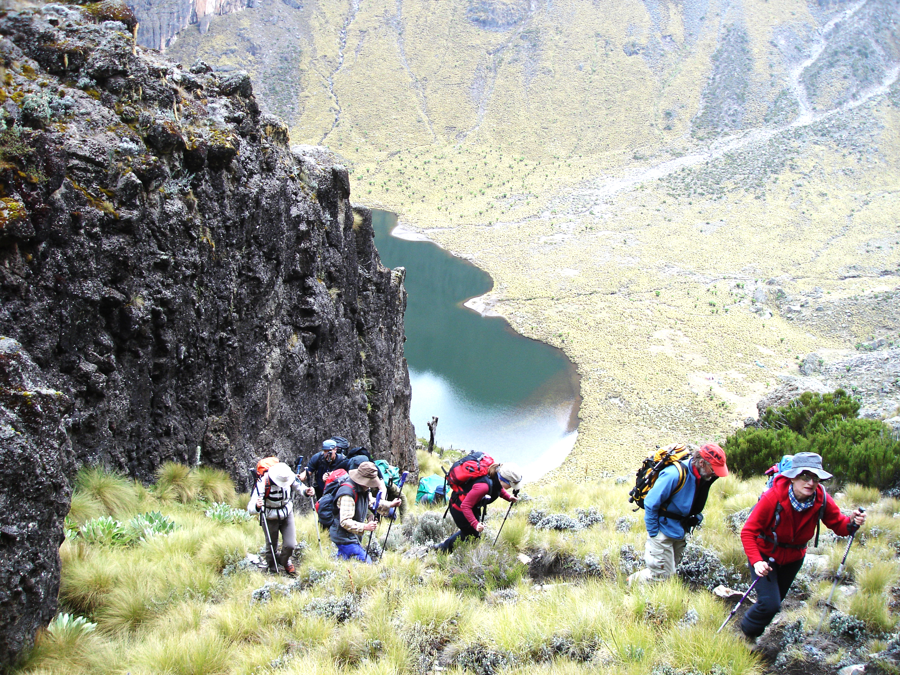 Nousemme paikoittain jyrkkää reittiä ylös Simba Tarniin, Point Lenanan huipun juurelle (4650 m). Täältä on hyvän sään aikana upeat näköalat Mt. Kenyan korkeimmille Nelion- ja Batian-huipuille. (A,L,I)