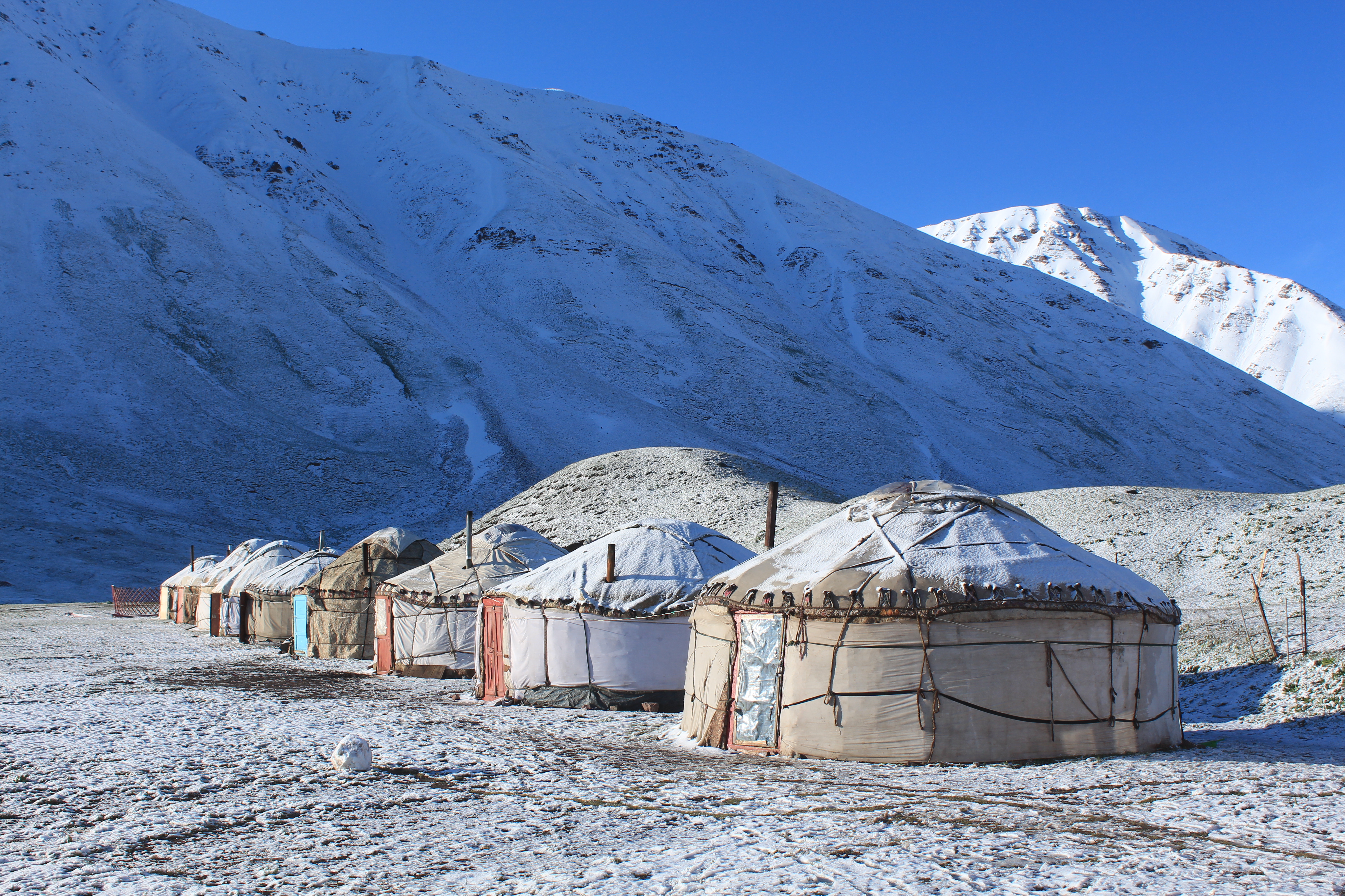 Tänään jätämme Tadžikistanin taaksemme ja siirrymme Kirgisiaan. Vuorossa on lyhyt ajomatka Kyzyl-Artin solaan, jossa hyvästelemme tadžikkioppaamme. Rajamuodollisuuksien jälkeen tapaamme kirgisialaisen kuljettajamme ja jatkamme matkaa Kirgisian puoleisen Pamirvuoriston sydämessä, 2974 metrin korkeudella, mahtavan, 7139-metrisen Pik Lenin-vuoren suojassa sijaitsevalle jurttaleirille. Kahden hengen jurtissa on omat wc:t ja suihkut. Yövymme täällä seuraavat kaksi yötä. (A,L,I)